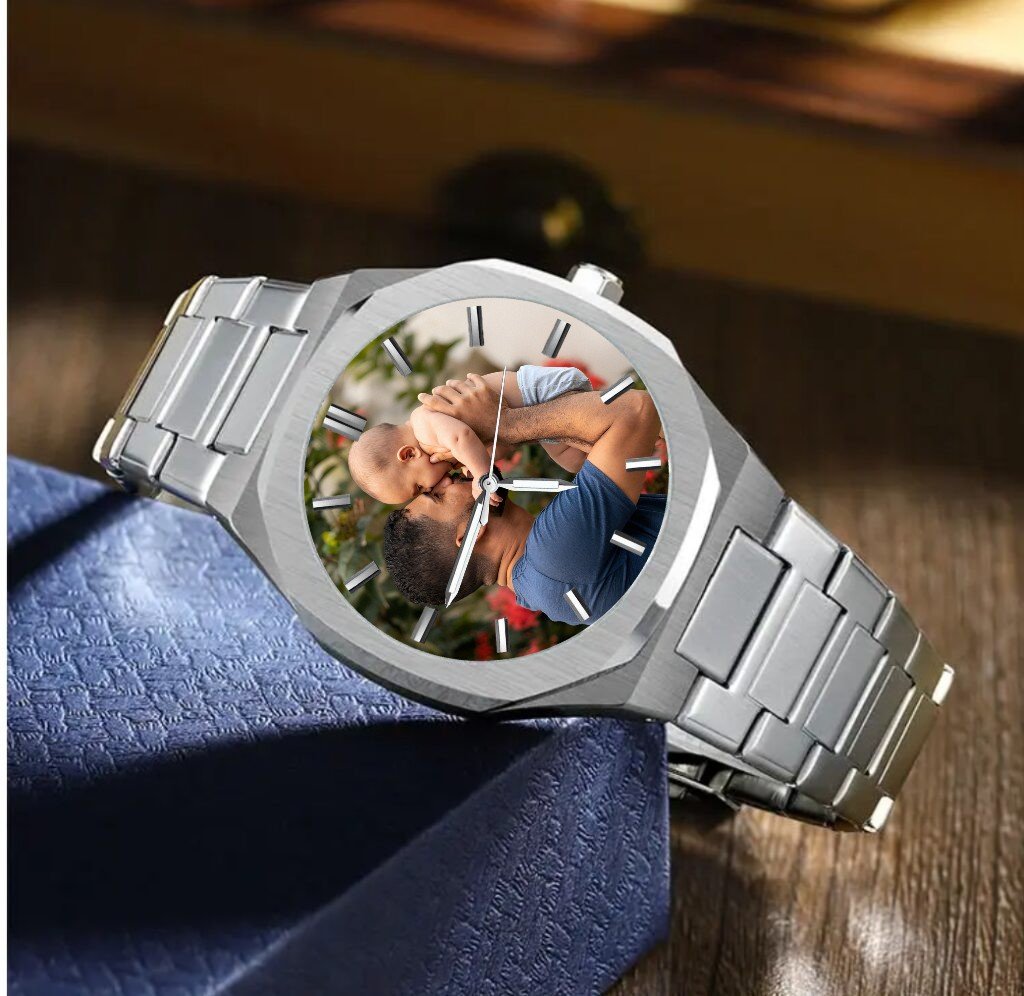 Reloj Personalizado para hombre con la fotografía de su elección material acero inoxidable color Plateado con finos detalles que lo harán lucir con estilo